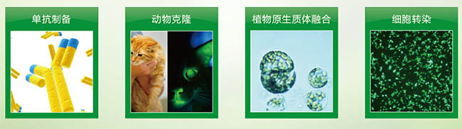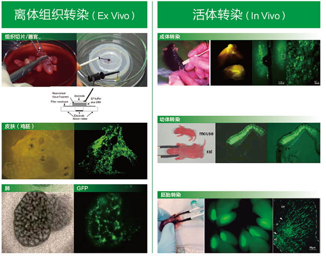 3、活體組織轉染(胚胎、肌肉、皮膚、肝臟、腎臟、肺、睪丸、卵巢、腦部、視網膜、角膜等小鼠、大鼠、斑馬魚、爪蟾、豬、羊、雞、兔子、蜜蜂、水蚤、渦蟲、植物種子等)